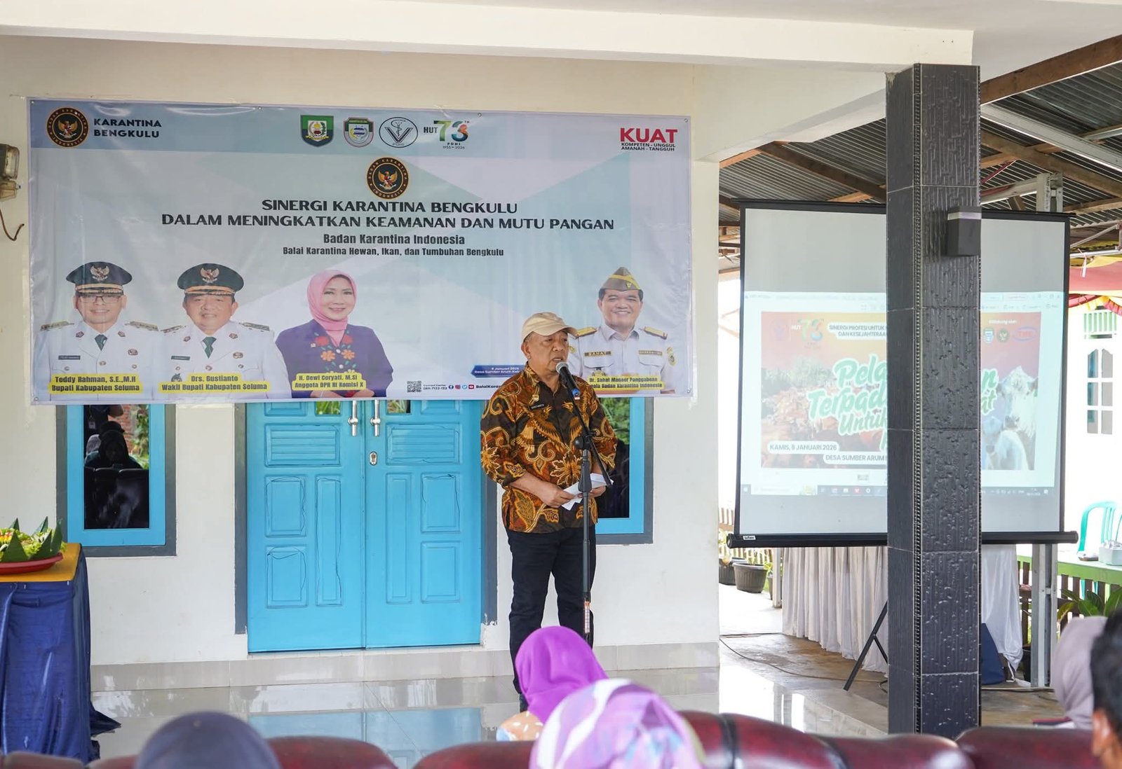 Seluma, – Wakil Bupati Seluma, Drs. H. Gustianto, menghadiri peringatan Hari Ulang Tahun (HUT) ke-73 Perhimpunan Dokter Hewan Indonesia (PDHI) yang dirangkaikan dengan sosialisasi Badan Karantina Indonesia Provinsi Bengkulu di Desa Sumber Arum, Kecamatan Sukaraja, Kamis (8/1/26).